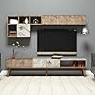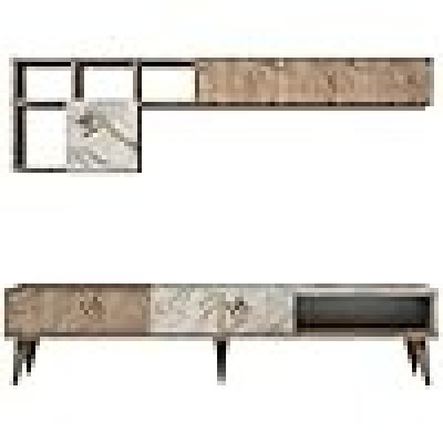 Muro equipado: composición de la sala de estar, gabinete de sala de estar multipropósito, guardarropa de televisión, 180x35h40 cm, nuez y mármol blanco