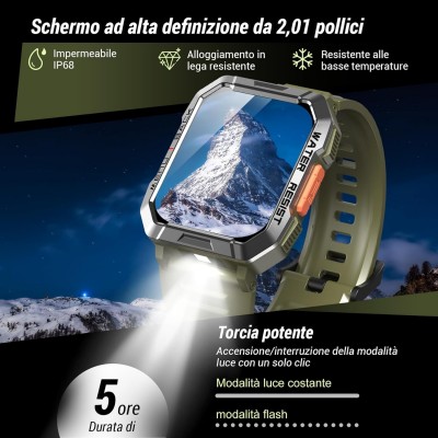 【Torcia LED & Bussola Integrata & 2 Cinghie】Il nostro smartwatch tattico include una torcia LED con un raggio di illuminazione di 6-10 m e un dispositivo bussola progettato per esercizi all'aperto. Questo orologio intelligente con 2 cinturini (in silicone e nylon), hai il massimo comfort e opzioni per la pelle sensibile.