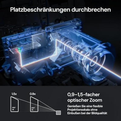 Ottica di Precisione per Qualsiasi Spazio - Con il sistema di lenti OpticFlex (rapporto di proiezione 0,9-1,5) e funzioni di regolazione automatica come la messa a fuoco e la correzione trapezoidale, ottieni un'immagine impeccabile in qualsiasi stanza senza perdita di nitidezza, sia compatta che spaziosa. Puoi proiettare fino a 300" con facilità, offrendo una soluzione portatile e flessibile che garantisce dettagli straordinariamente nitidi, superando i limiti delle TV tradizionali.